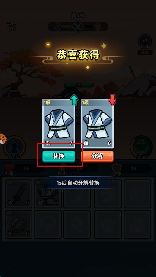 2、戰斗中獲得新裝備時,可點擊替換按鈕,將現有裝備換成屬性更優的新裝備,提升角色的血量等屬性。