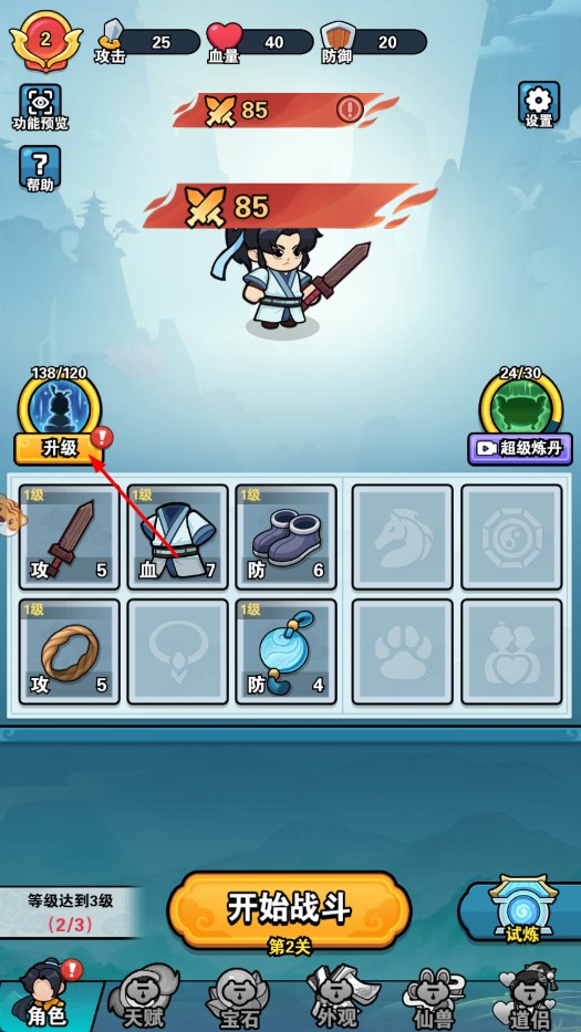 4、在角色界面,當經驗值滿足要求時,點擊升級按鈕提升角色等級,解鎖更多功能,為后續戰斗做好準備。
