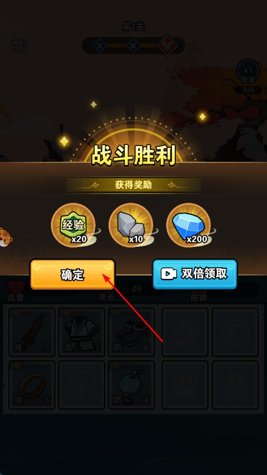 3、戰斗勝利后,會獲得經驗、石頭、鉆石等獎勵,點擊確定按鈕領取獎勵,也可選擇雙倍領取獲得更多獎勵。