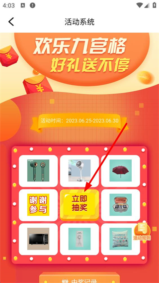 3、活動系統中,有歡樂九宮格抽獎活動,活動時間內點擊立即抽獎,有機會獲得耳機、風扇、雨傘等好禮。