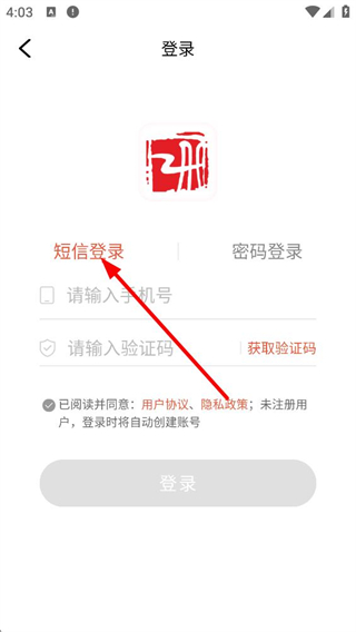 4、登錄時可選擇短信登錄,輸入手機號和驗證碼,勾選同意用戶協議和隱私政策后即可登錄,也可選擇密碼登錄方式。