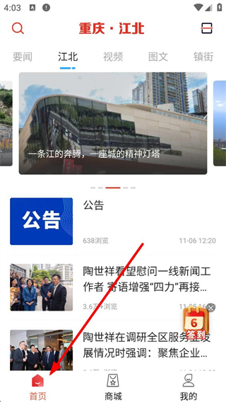 1、首頁可查看重慶江北的要聞、視頻、圖文、鎮街等資訊,還有公告信息,了解當地最新動態。