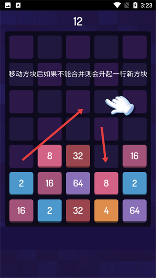 4、移動方塊后,如果不能合并,就會升起一行新方塊,繼續在新的方塊布局里,尋找可合并的方塊,持續進行合并操作。