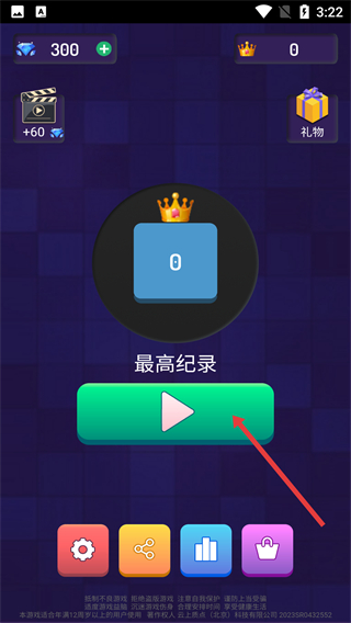 1、界面顯示最高紀錄等信息,點擊綠色開始按鈕,開啟數字方塊合并的游戲,準備進行方塊合并操作。