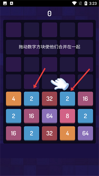 2、按照提示拖動數字方塊,讓它們合并在一起,通過拖動操作,嘗試將相同數字的方塊合并,積累分數。