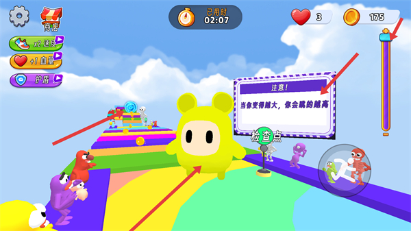 4、隨著角色變大,能跳得更高,利用這一特點,通過各種障礙,到達檢查點,持續推進,完成闖關任務。