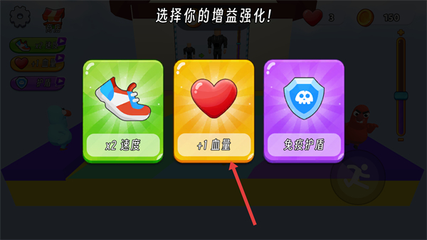 1、可選擇增益強化,有速度、血量、免疫護盾等選項,挑選合適的增益,為后續闖關助力。