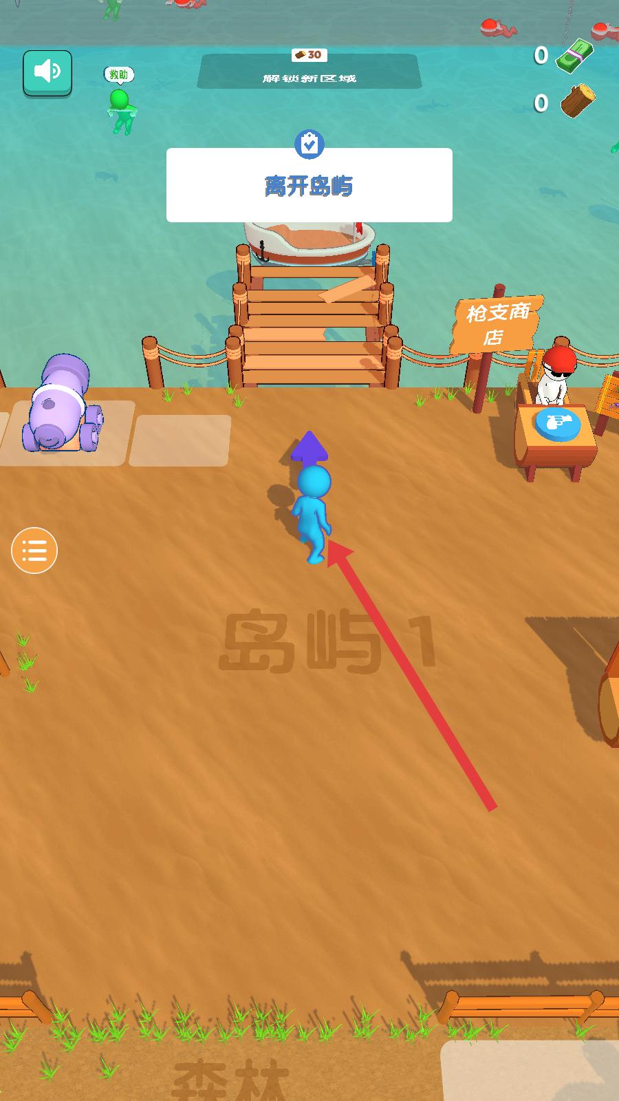 1、進入佳作后,藍色角色位于島嶼1,界面有離開島嶼提示,操控角色朝著碼頭方向移動,經過槍支商店等區域,準備前往船只處,開啟新的冒險環節。