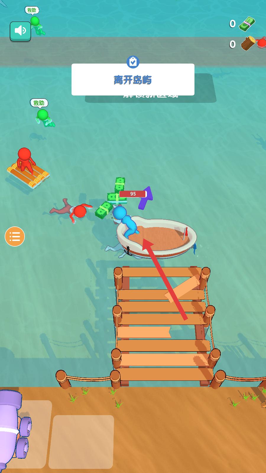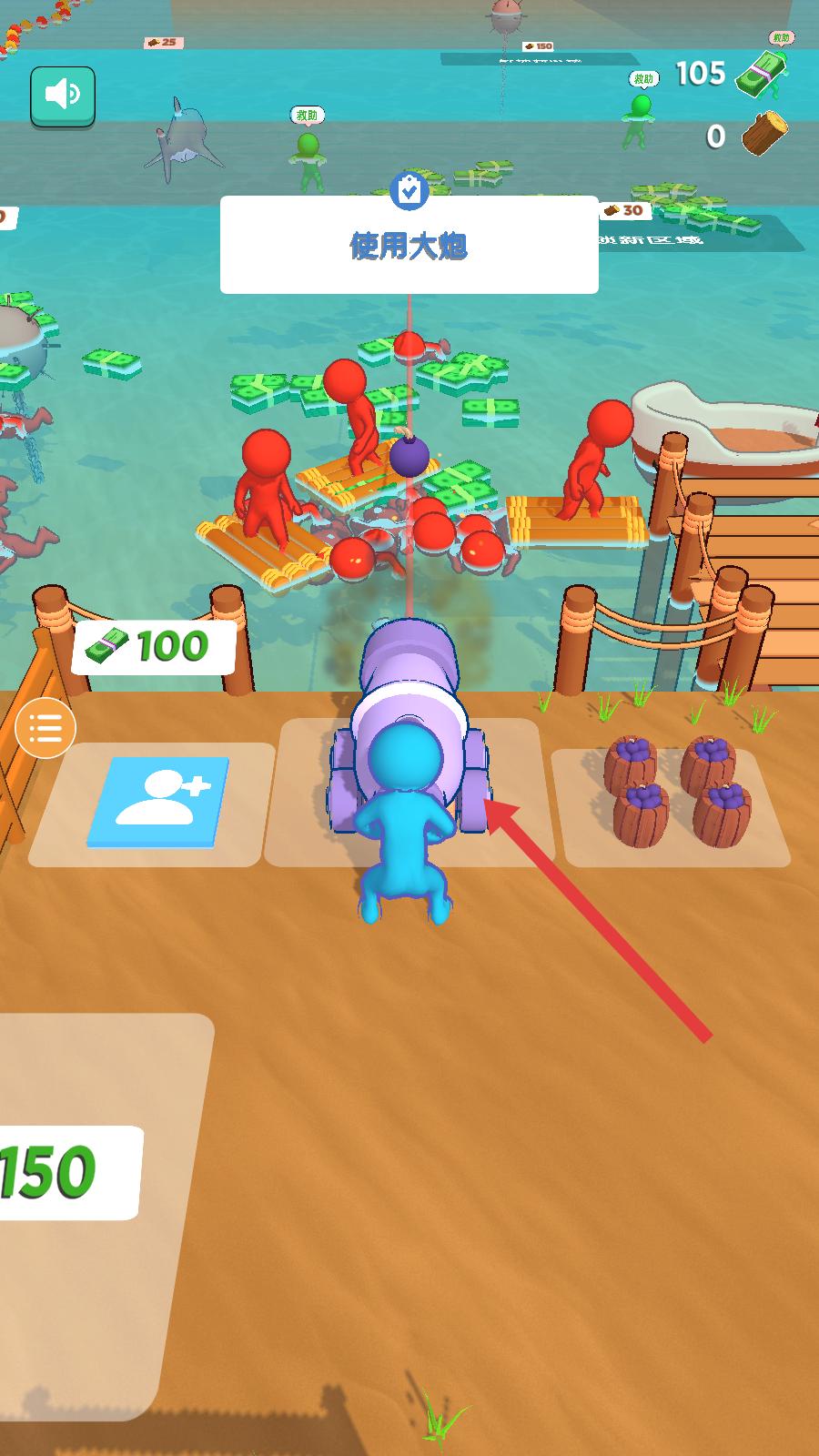 3、回到島嶼后,操控角色靠近大炮,花費相應資源,調整射擊方向,對準海上紅色敵人的筏子,發射炮彈攻擊,清除敵人,繼續海島冒險。