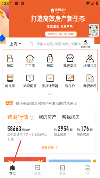 2、進入首頁界面,能看到新房二手房等功能按鈕,還有諸葛行情板塊展示房價及房源數量,可通過這些功能入口選擇對應房產服務,查看相關行情信息。