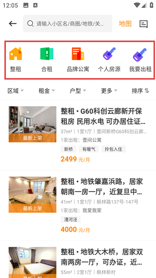 3、進入租房相關頁面,有整租合租等分類選項,還有區域租金戶型等篩選條件,可利用這些篩選條件,查找符合自身需求的租賃房源。