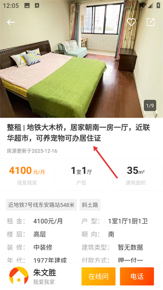 4、進入房源詳情頁,能看到房源的租金戶型面積等信息,還有中介的在線問和電話按鈕,可查看房源細節并咨詢相關情況。