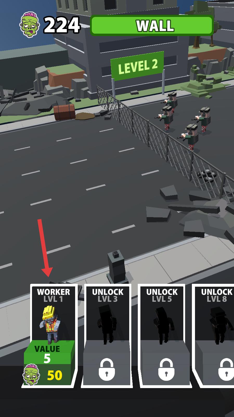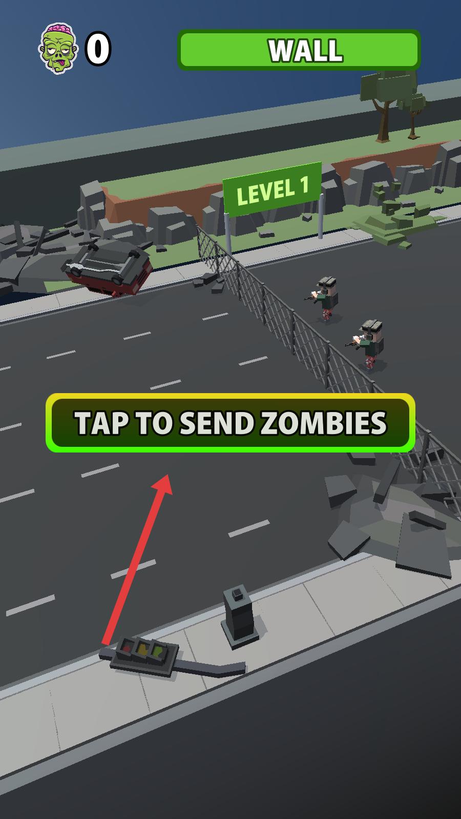 1、進入佳作界面,界面呈現關卡1,點擊中間點擊派出僵尸區域,即可召喚僵尸隊伍,朝著對面圍欄防線前進。