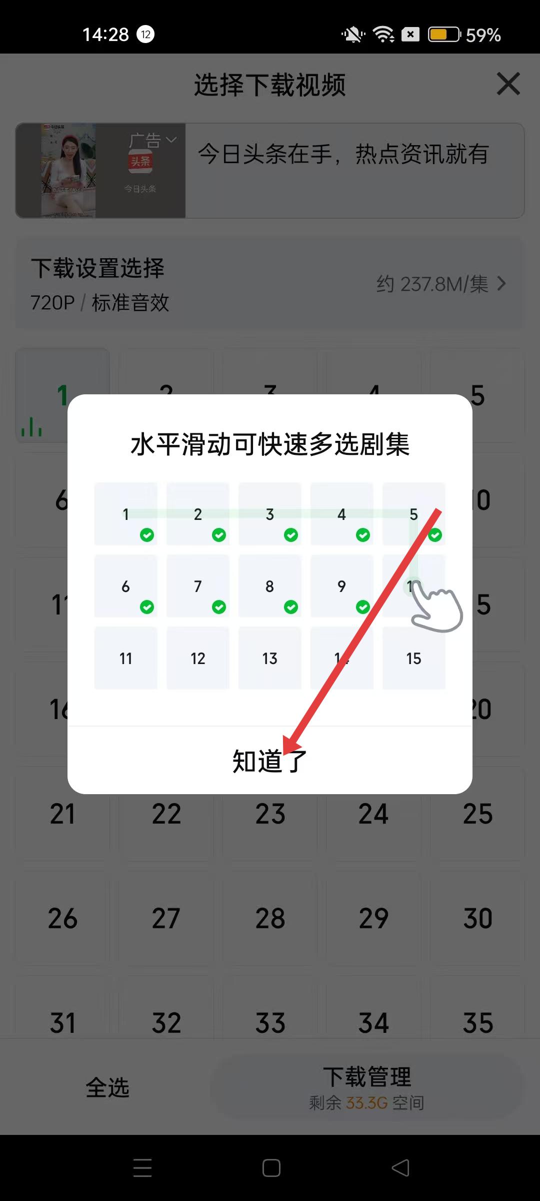 3、此時會彈出水平滑動可快速多選劇集的提示框,點擊知道了,即可進入劇集選擇界面。