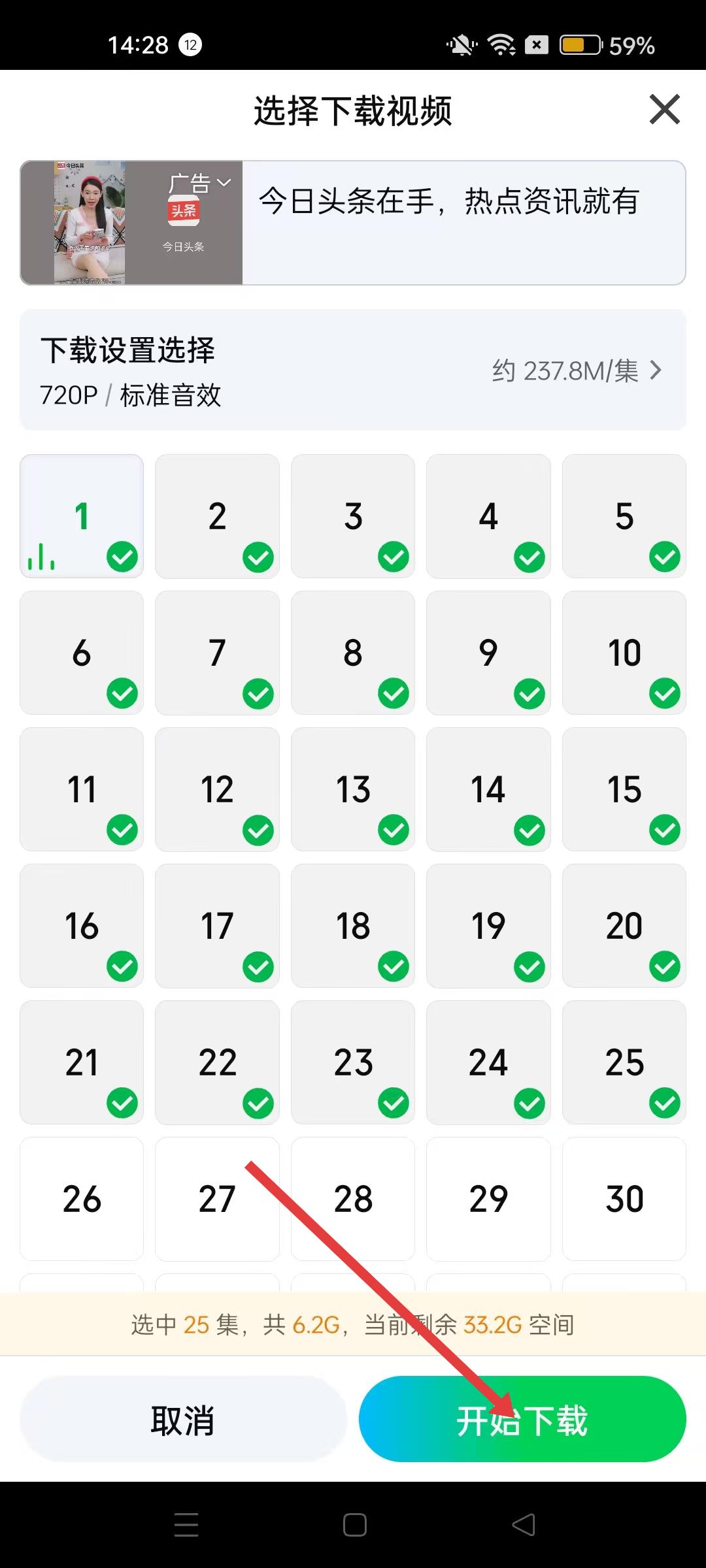 4、選擇下載視頻界面,選好劇集后,點擊開始下載按鈕,即可開始下載所選劇集。