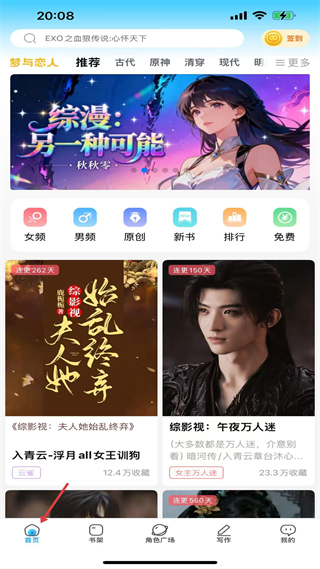 1、首頁有女頻、男頻等分類入口,推薦綜影視夫人她始亂終棄等小說,可找各類題材作品,還有簽到功能。