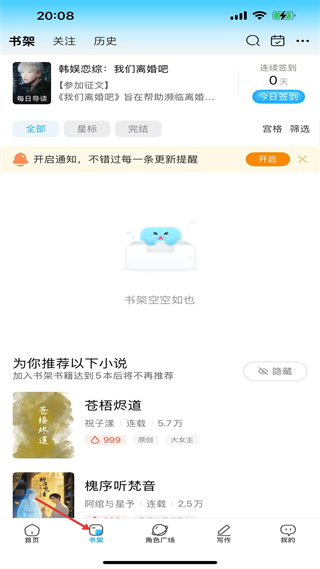 2、書架頁可查看關注、歷史,當前書架為空,推薦蒼梧燼道等小說,加入書籍后可管理閱讀內容。