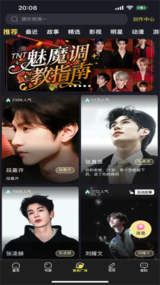 3、角色廣場頁有推薦、最近等分類,展示段嘉許、張真源等角色相關內容,可瀏覽明星、動漫類創作。