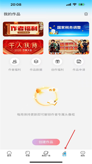 4、寫作頁有作者福利、作品數據等功能,可創建作品,每周更新還能解鎖作者專屬頭像框,助力創作。