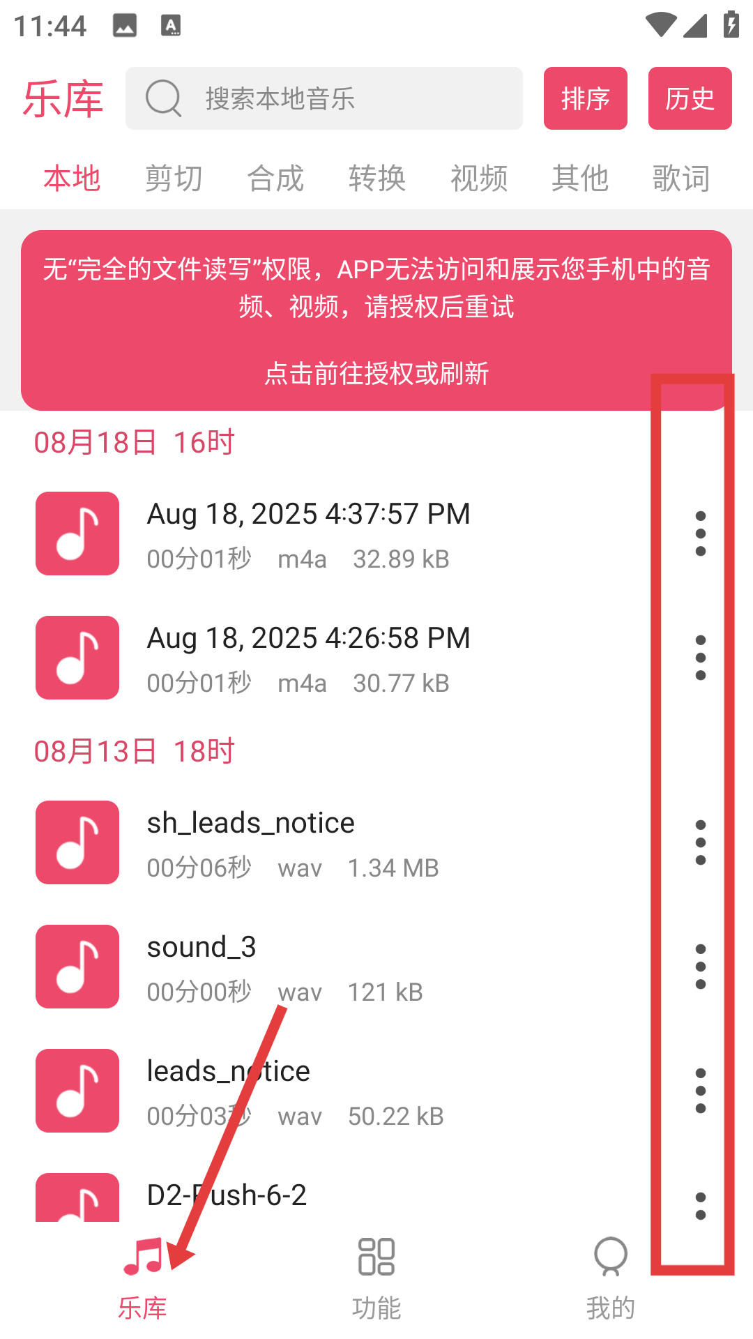1、軟件樂庫是操作起點,這里展示本地音樂列表,找到想剪輯的音頻,點擊右側三點圖標可喚起功能菜單,為后續剪輯做準備。