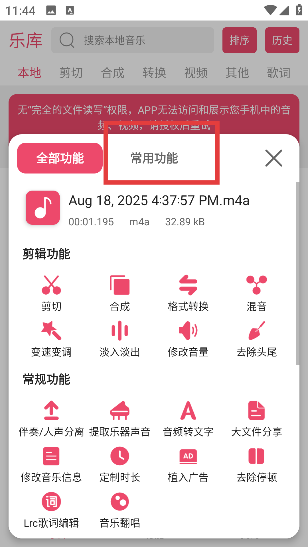 2、在音頻右側三點菜單里切換到常用功能,能看到剪切、合成等豐富操作,選剪切功能進入剪輯頁面,軟件提供直觀的波形圖和時間軸,快速開啟音樂裁剪流程。