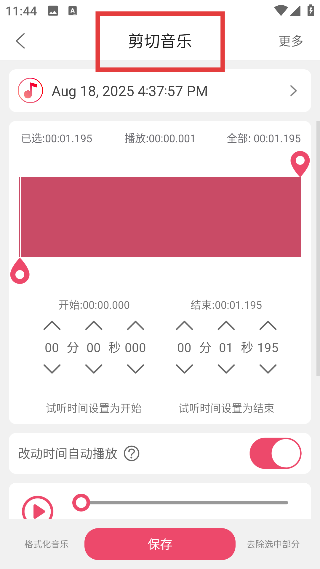3、進入剪切音樂界面,拖動時間軸標記或手動輸入開始、結束時間,確認后點保存就能導出剪輯好的音樂,輕松完成音頻裁剪制作,滿足個性化音樂剪輯需求。