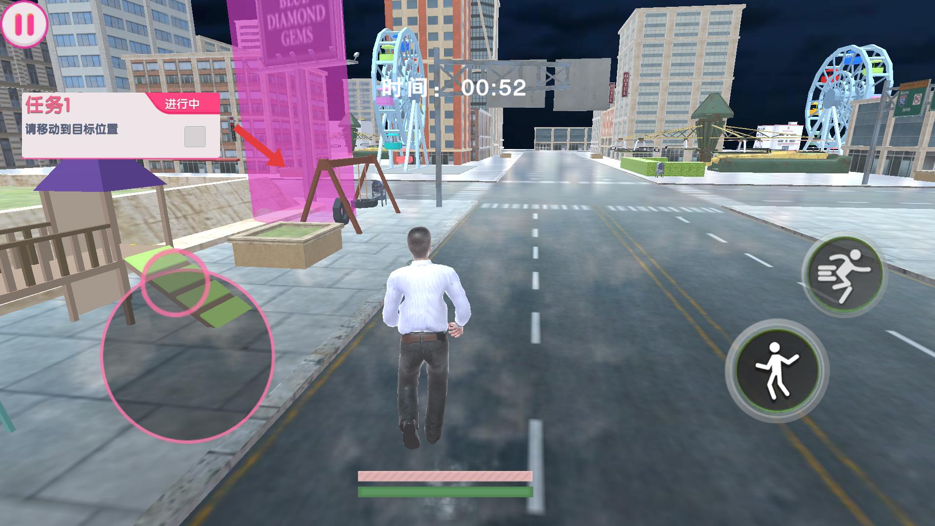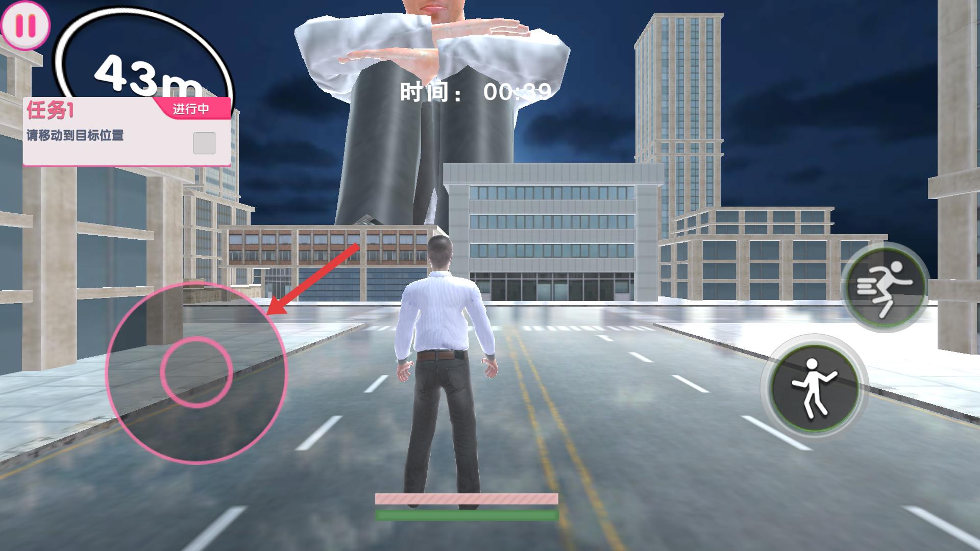 2、進入游戲后,左側有任務提示請移動到目標位置,通過左側的操控區域,控制角色在城市道路上移動,朝著目標方向前進。