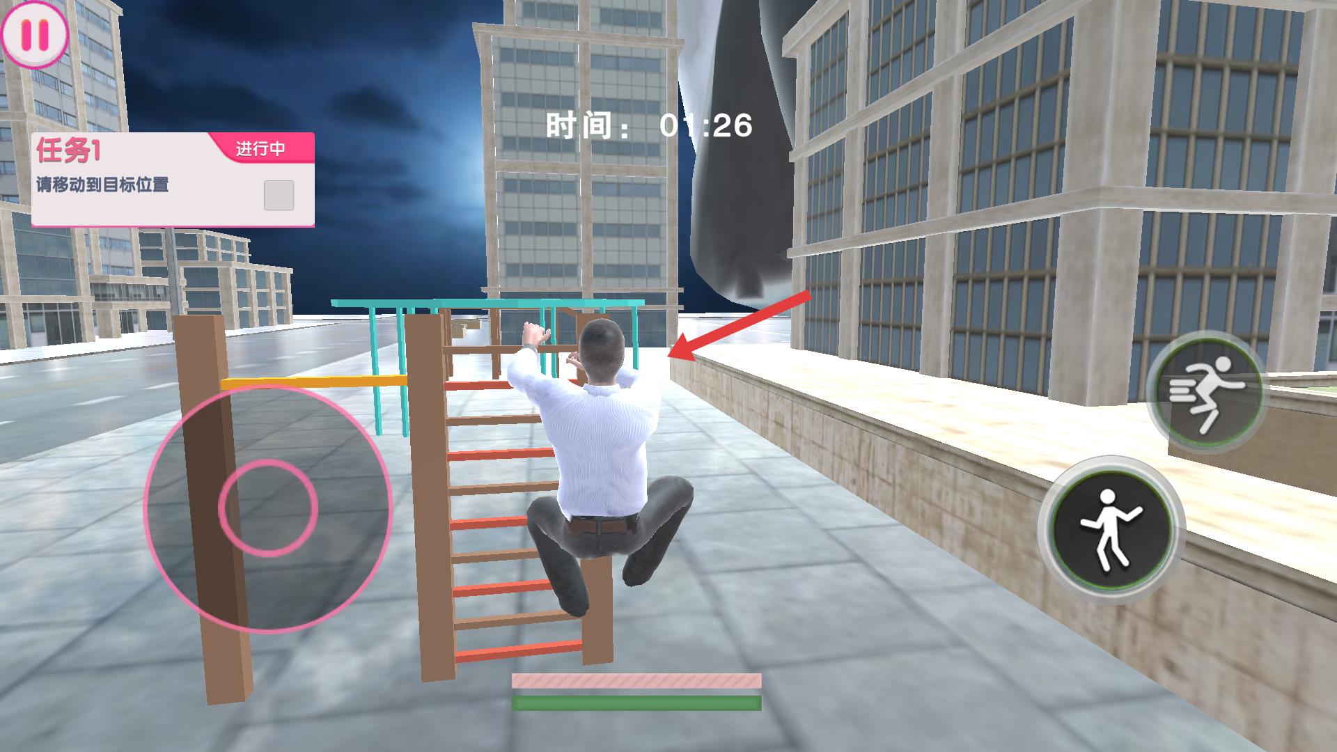 4、當遇到諸如健身器材類的障礙物時,可操控角色進行攀爬等動作,跨越障礙,持續朝著任務提示的目標位置移動,推進任務進程。