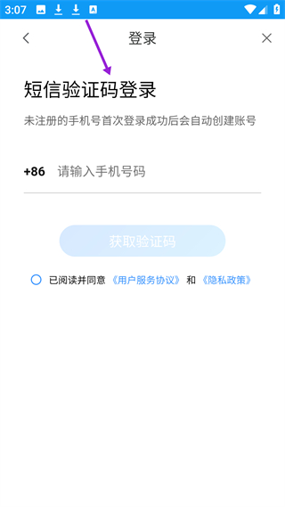 1、登錄界面提供短信驗證碼登錄,輸入手機號獲驗證碼即可,未注冊手機號首次登錄自動建號,是使用APP功能的前提。