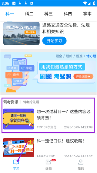 2、學習界面有科一到拿本分類,展交規知識學習入口和駕考資訊,方便用戶進行科目一理論學習和了解駕考信息。
