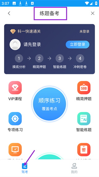 3、練題備考界面有VIP課程等功能入口,還有摸底分析等備考流程,方便用戶進行駕考題目練習和備考。