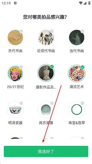 1、進入興趣選擇頁面,勾選感興趣的拍品類別,比如21世紀、攝影作品及等,點擊我選好了按鈕完成選擇。