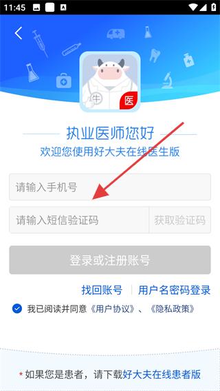 3、在執業醫師登錄頁面,輸入手機號,點擊獲取驗證碼,輸入短信驗證碼,勾選同意用戶協議和隱私政策,點擊登錄或注冊賬號按鈕,完成賬號注冊或登錄。