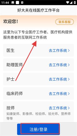 2、進入好大夫在線醫療工作平臺,可查看為醫生、助理醫師、護士等專業醫療工作者提供的服務系統,點擊注冊,登錄按鈕,開始賬號注冊或登錄流程。