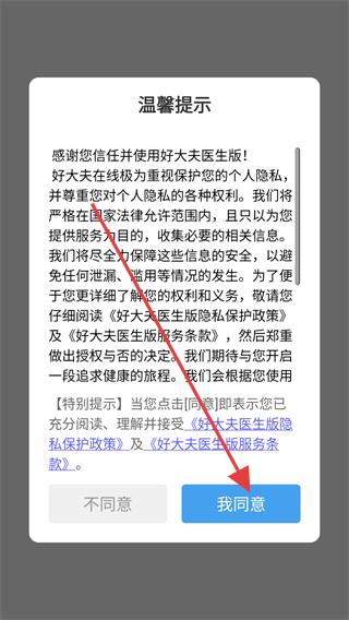 1、打開好大夫醫生版,在溫馨提示頁面點擊我同意按鈕,同意好大夫醫生版的隱私保護政策和服務條款,進入軟件主界面。