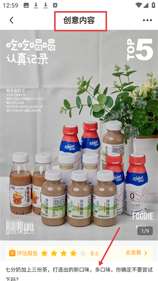 4、創意內容頁,展示飲品創意內容,有評估報告評分,介紹產品新口味,呈現優質創意內容。