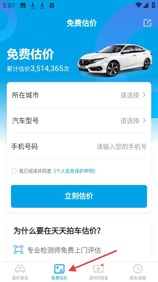 2、點擊免費估價頁面,累計估價次數可觀,用戶需填所在城市、車型及手機號,勾選協議后可立刻估價。