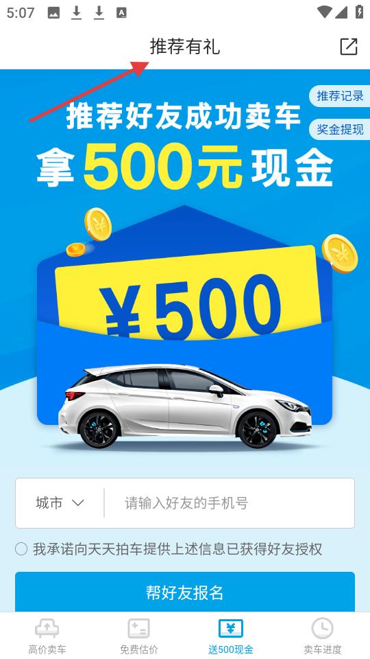 3、點擊推薦有禮板塊,推薦好友賣車成功獎500元,設有推薦記錄和獎金提現功能,還能幫好友報名參與賣車。