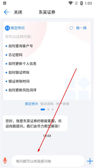 4、進入客服對話頁面查看猜您想問的常見問題,在輸入框填寫疑問內容,發送給智能客服,獲取賬戶密碼更新等相關問題的解答。
