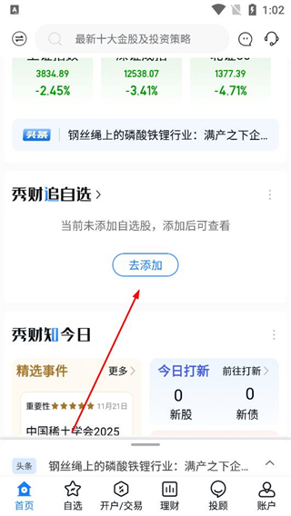 1、打開軟件進入首頁,查看市場數據及資訊,點擊去添加按鈕將內容加入自選,瀏覽精選事件和今日打新信息,獲取市場相關動態。