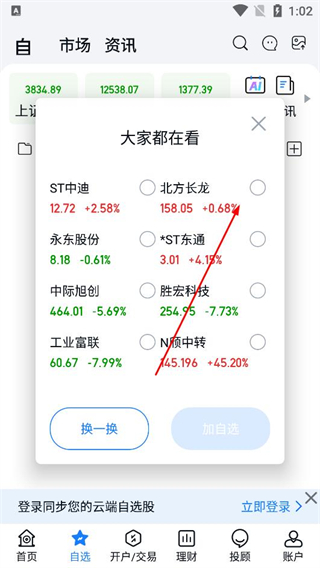 2、進入自選頁面查看大家都在看的股票列表,選擇感興趣的股票,點擊加自選按鈕添加到個人自選,也能點擊換一換查看更多股票。