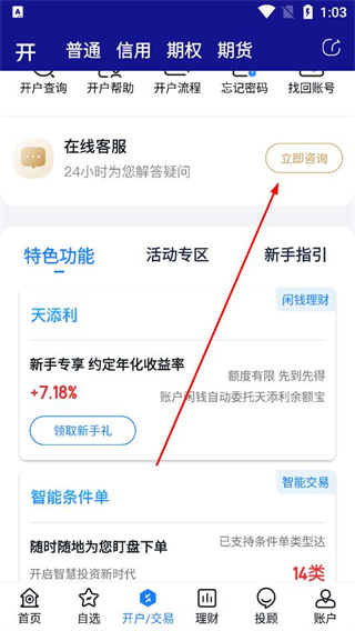 3、進入開戶交易頁面查看開戶咨詢等服務,點擊立即咨詢聯系在線客服,瀏覽特色功能里的天添利等產品,領取新手禮參與活動。
