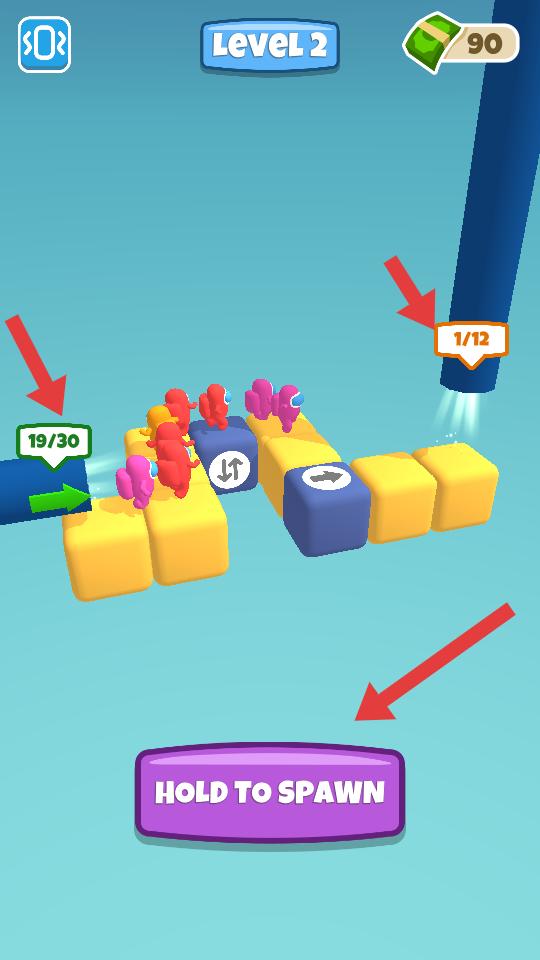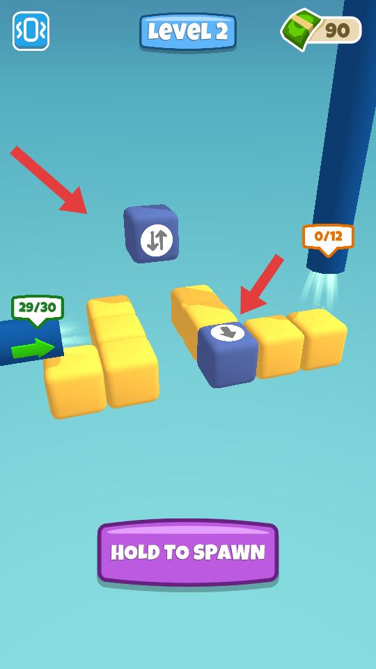 2、關卡中能看到帶有箭頭標識的方塊和路徑,點擊HOLD TO SPAWN按鈕,生成相關元素。
