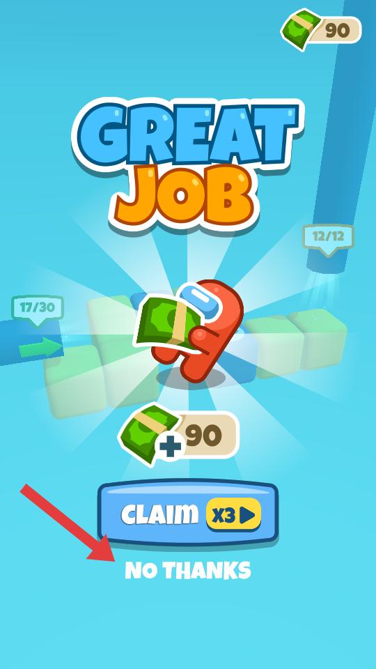 4、成功完成關卡目標后,會顯示Great Job界面,獲得金錢獎勵,可選擇CLAIM或NO THANKS,繼續下一關。