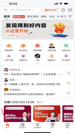 1、首頁聚合推薦內容與功能入口,展示直播預告,是發現知識內容的核心入口,也可通過搜索精準查找所需資源。