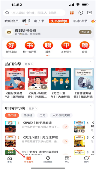 2、聽書看書頁聚焦聽書服務,設多個內容板塊,展示熱門推薦與排行,開通會員可暢享全場,適配音頻學習場景。