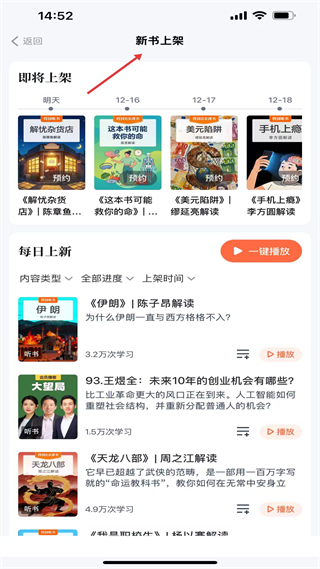 3、新書上架頁分即將上架和每日上新,支持內容預約與篩選,可一鍵播放新內容,便于及時獲取最新的知識資源。