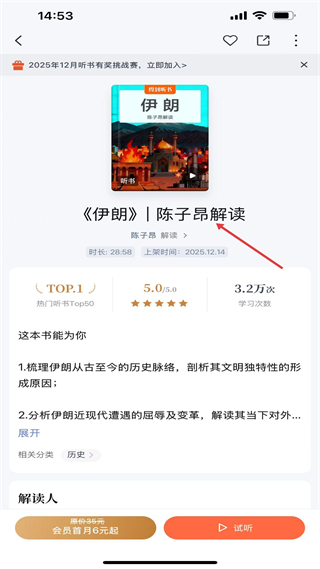 4、聽書詳情頁展示內容信息與核心價值,支持試聽收藏等操作,關聯相關分類,助力用戶深入了解并使用內容。