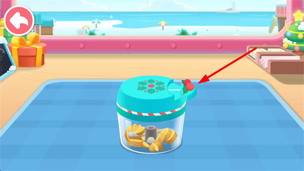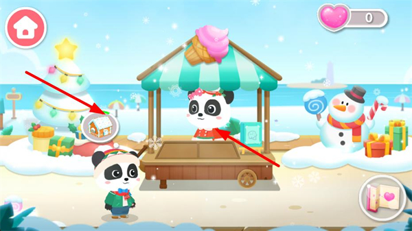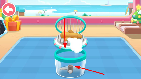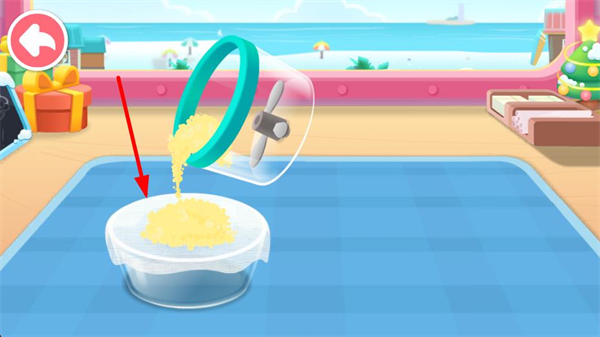 1、看到場景里的標識,點擊對應選項開啟制作流程,與萌熊互動,準備進行甜品原料的處理環節。