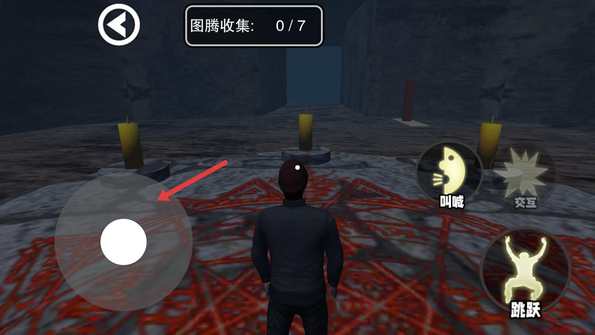 2、進入迷宮后,通過左側的移動按鈕操控角色移動,在場景中尋找圖騰,同時可利用叫喊、交互、跳躍等功能,應對不同情況。